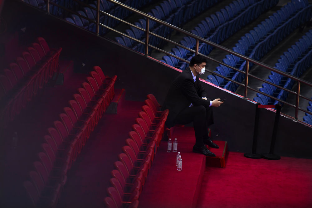 ↑2020年6月20日,2019-2020赛季中国男篮职业联赛(CBA)在东莞和青岛以空场赛会制方式复赛,中国篮球协会主席、CBA联盟董事长姚明在青岛赛区看台观看比赛。新华社记者 李紫恒 摄