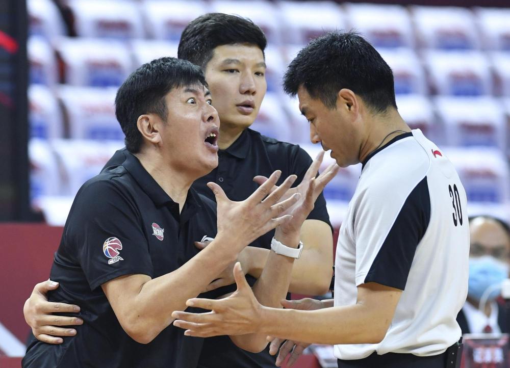 ↑2020年7月9日,时代中国广州队主教练丁伟(左)在山东青岛举行的2019-2020赛季中国男子篮球职业联赛(CBA)复赛第二阶段(红岛赛区)与北京控股队的比赛中与裁判交流。新华社记者 朱峥 摄