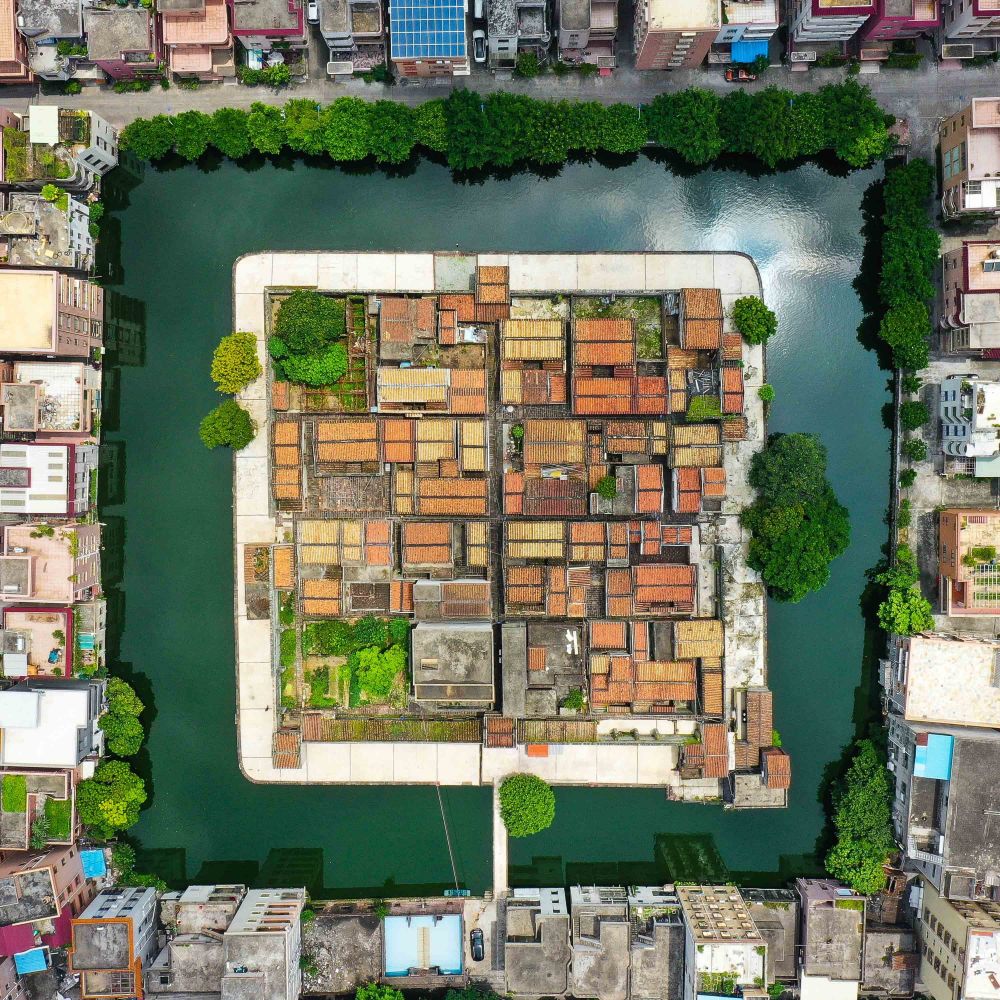 ↑这是2020年6月24日拍摄的位于广东东莞虎门镇白沙社区的逆水流龟村堡(无人机照片)。新华社记者 刘大伟 摄