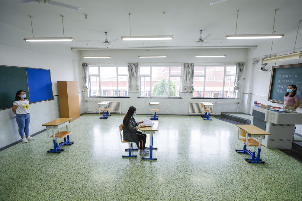 ↑2020年7月3日,在2020年全国高考即将拉开帷幕之时,老师在北京市第十二中学考点的备用考场内进行考前模拟演练。新华社记者 沈伯韩 摄