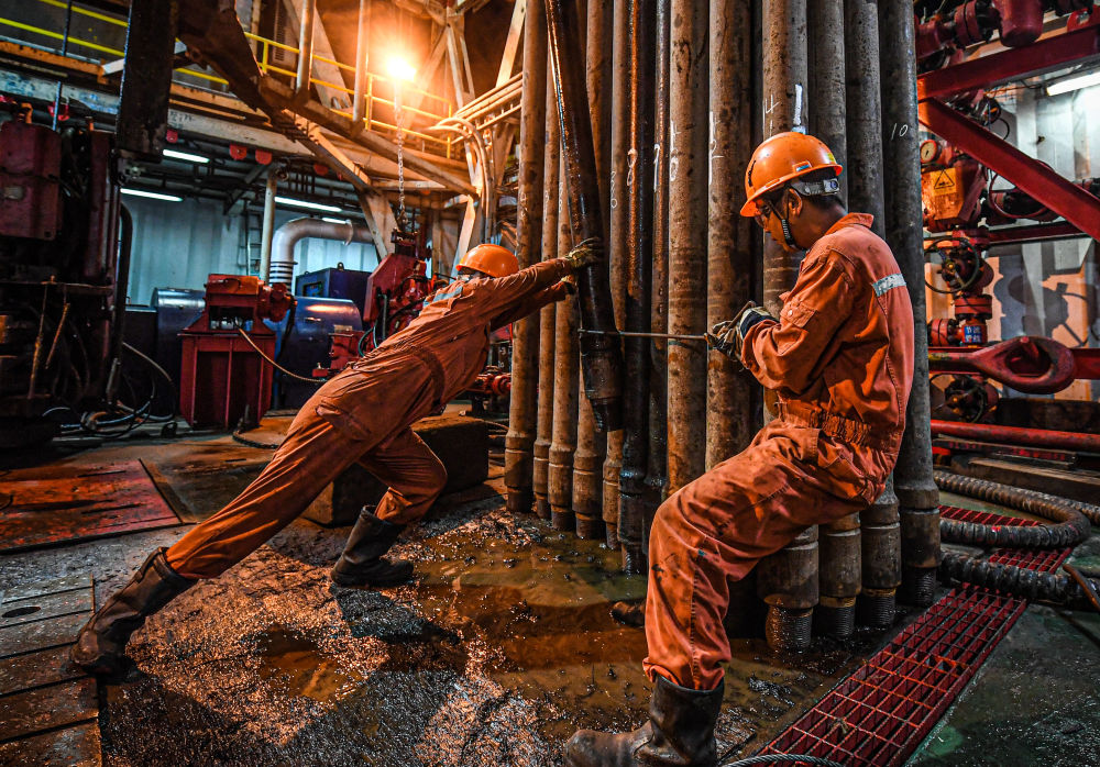 ↑2020年7月26日,在位于南海北部海域的勘探三号钻井平台上,钻井工人在摆放钻杆。新华社记者 蒲晓旭 摄
