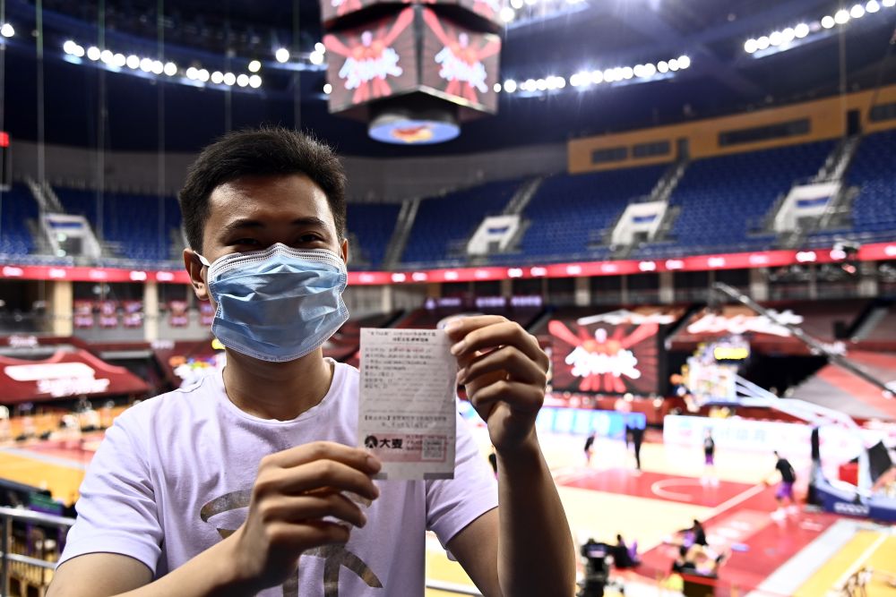 ↑2020年7月26日,苏柯帆在青岛国信体育馆展示自己的纸质球票。他成为CBA联赛复赛允许观众现场观赛后,首位进场的观众。新华社记者 郭绪雷 摄