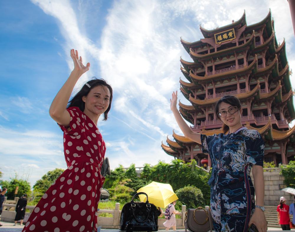 ↑2020年8月7日,受邀来湖北旅游的海南援鄂医疗队员陈小妹(左)与同事计超在黄鹤楼景区观光。湖北省组织“与爱同行 惠游湖北”活动,陆续邀请援鄂医护人员代表以及湖北医护人员、社区工作者、志愿者等走进景区,饱览荆楚风貌。新华社记者 肖艺九 摄