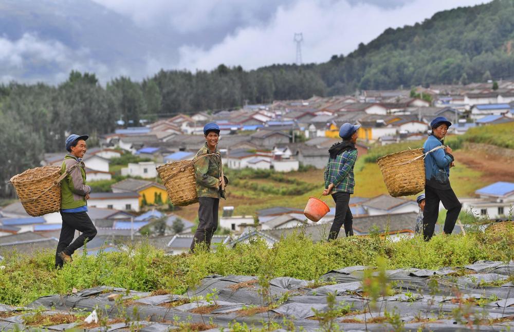↑2020年8月13日,四川省凉山彝族自治州布拖县拖觉镇老吉村的妇女在去往蓝莓种植基地务工的路上。新华社记者 刘坤 摄