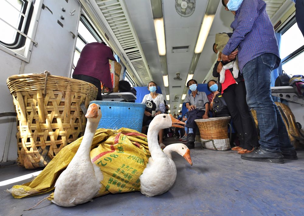 ↑2020年8月14日,乘客携带家禽乘坐“小慢车”。绿皮的车厢,简单的座椅,30年未变的票价,这是一对穿越凉山彝族自治州往返于普雄和攀枝花之间的5633/5634次列车。全列13节车厢,走满全程353公里需要9个多小时,因为行驶速度较慢,“小慢车”因此得名。慢悠悠的火车沿途要停靠26个站,如同一座流动的村庄,尽自己最大能力解决沿途百姓出行问题。新华社记者 刘坤 摄