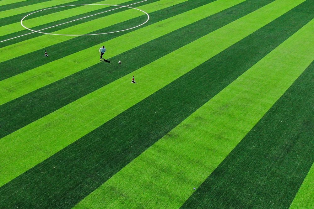 ↑2020年8月19日,青海省果洛藏族自治州玛多县玛查理镇噶丹村村民在村旁的体育场踢球(无人机照片)。2016年开始,玛多县对境内扎陵湖乡、黄河乡、玛查理镇三个乡镇22个村庄的1036户居住分散、偏远的建档立卡贫困户进行易地搬迁、集中安置。2018年10月,噶丹村全村完成入住。新华社记者 张龙 摄