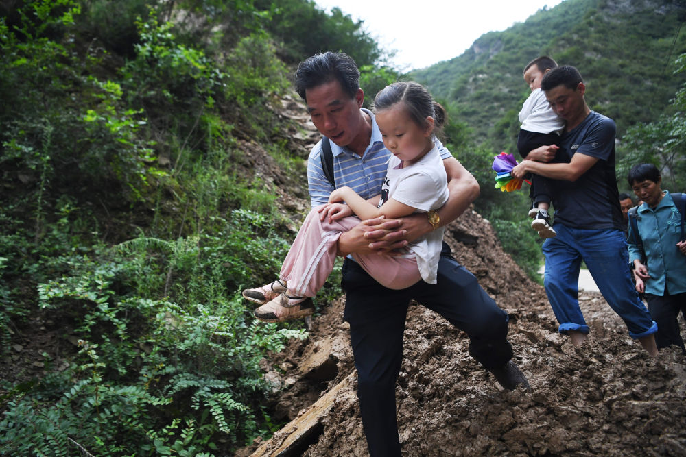 ↑2020年8月22日,在陇南市武都区洛塘镇和平村,家长带着孩子通过塌方路段前往学校所在地。临近开学,甘肃省陇南市各县区部分村庄通往外界的道路因暴洪、滑坡、泥石流等自然灾害中断。为确保孩子们顺利返校,当地组织多支道路抢险小分队,抢修中断的通村道路,一线干部群众和家长自发组织起志愿服务队,守护孩子们的平安上学路。新华社记者 陈斌 摄
