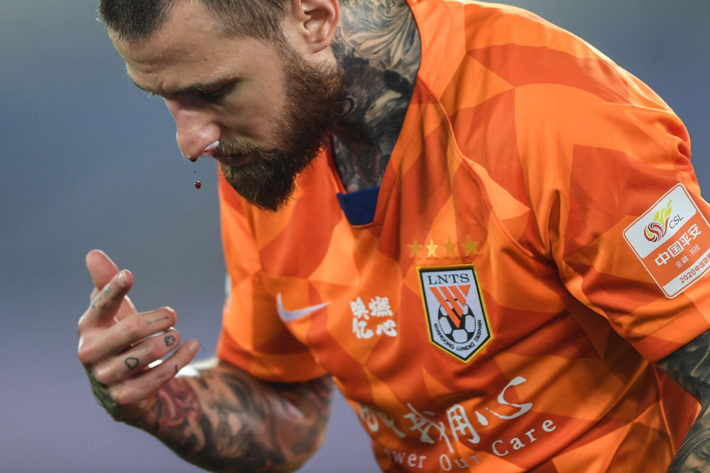 ↑2020年8月29日,山东鲁能泰山队球员卡达尔在2020中国平安中国足球协会超级联赛(大连赛区)第八轮与大连人队的比赛中鼻子受伤流血。新华社记者 潘昱龙 摄