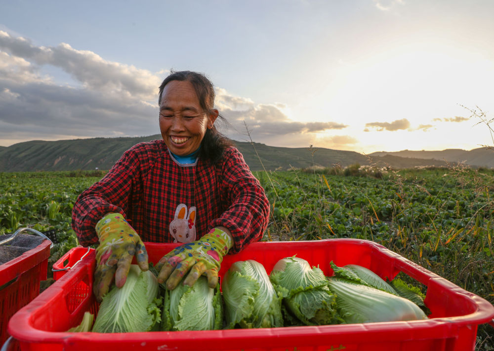 ↑2020年9月7日,农民在宁夏回族自治区西吉县硝河乡高原村红祥蔬菜种植专业合作社蔬菜种植基地收获白菜。新华社记者 杨植森 摄