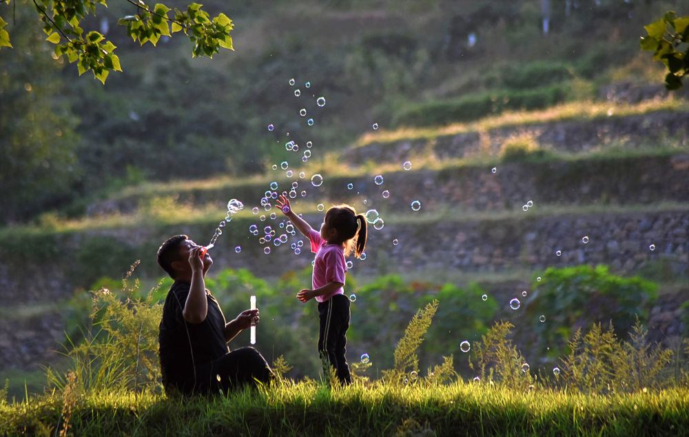 ↑2020年9月10日,在山东省淄博市沂源县张家坡镇河东村,董岳完成一天的驻村工作后和女儿在村边的树林里玩耍。董岳在2019年7月从山东省淄博市水利局被选派到河东村担任驻村第一书记。董岳和身为教师的妻子商定,一人一周轮流带着女儿董载壹。为不耽误驻村工作,轮到董岳照看女儿时,他便把女儿接到村里,白天带着女儿挨家挨户走访,晚上既当爹又当妈地照顾女儿吃饭睡觉。新华社发(赵东山 摄)