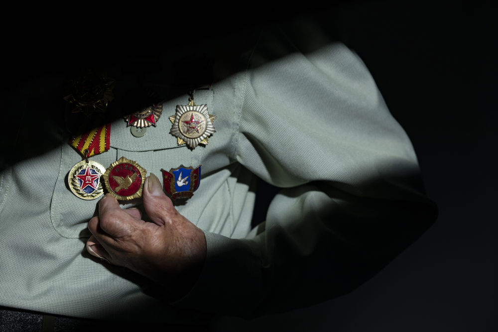 ↑2020年9月28日,在四川省成都市,志愿军老战士涂伯毅抚摸军功章。涂伯毅,1931年生,重庆云阳人,1950年随部队入朝。他经历了抗美援朝战争第一、二、三、四次战役,1951年2月,遭敌人凝固汽油弹袭击,全身大面积烧伤,致一级伤残。新华社记者 沈伯韩 摄