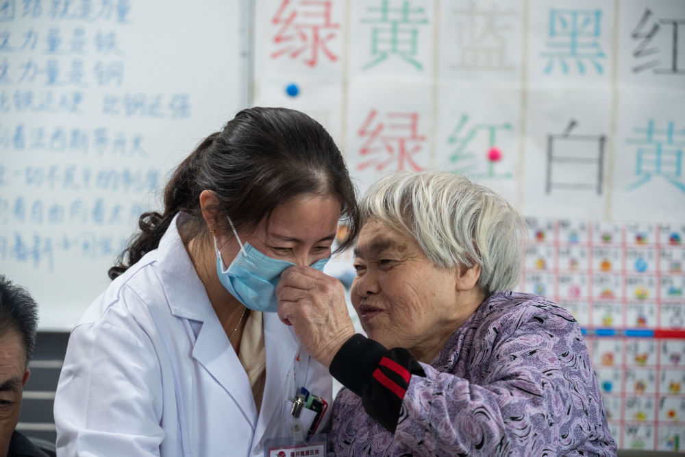 ↑2020年10月12日,在湖南省邵阳市隆回县隆回魏源医院,一名老年公寓的老人跟医护人员亲密交流。该院于2010年开设医养结合科,为失能失智老人提供日常护理、医疗康复、休闲娱乐、餐饮服务等服务。新华社记者 才扬 摄