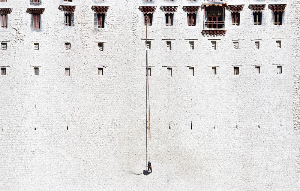 ↑2020年10月28日,工作人员在粉刷布达拉宫。每年秋冬交替时节,布达拉宫管理处都要组织工作人员对外墙进行粉刷“美容”。新华社记者 普布扎西 摄