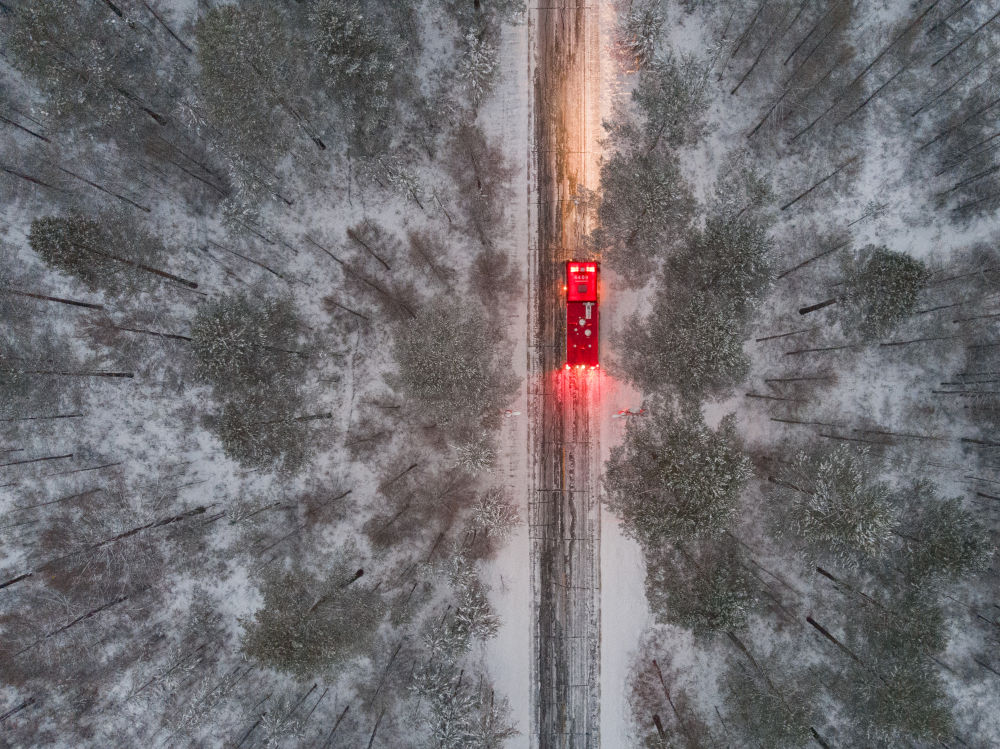 ↑2020年11月7日,黑龙江省漠河市北极村消防救援站的消防车在路上巡查(无人机照片)。新华社发(张涛 摄)
