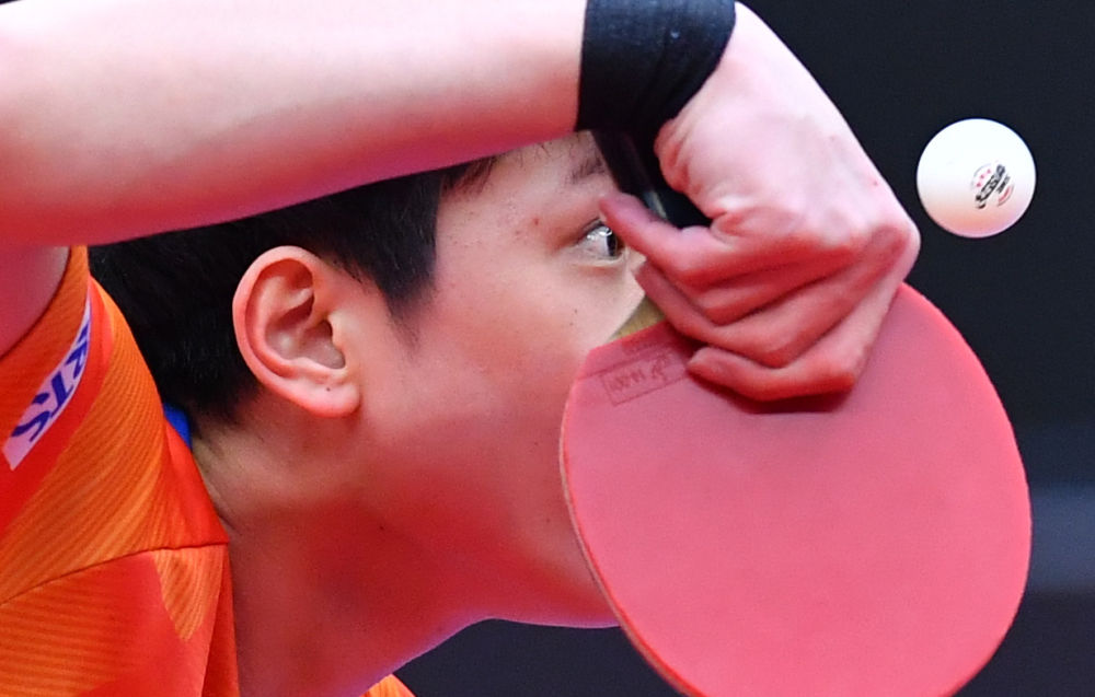 ↑2020年11月14日,日本选手张本智和在山东威海进行的2020国际乒联男子世界杯四分之一决赛与瑞典选手法尔克的比赛中发球。新华社记者 朱峥 摄