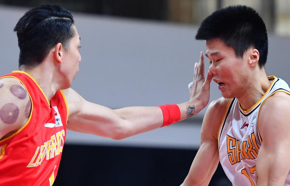 ↑2020年12月22日,深圳马可波罗队球员沈梓捷(左)在浙江诸暨举行的2020-2021赛季中国男子篮球职业联赛(CBA)第二阶段第21轮比赛中防守山西汾酒股份队球员刘冠岑。新华社记者 朱峥 摄