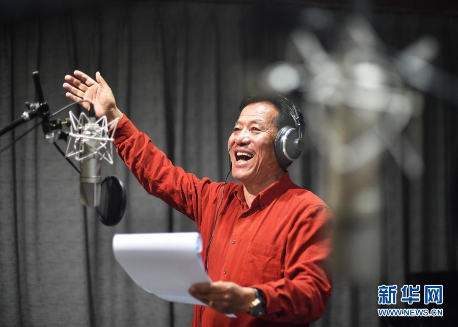 在中国西藏广播电影电视藏语节目译制中心,配音演员伦珠巴桑给藏语节目配音(2019年3月6日摄)。新华社记者 普布扎西 摄