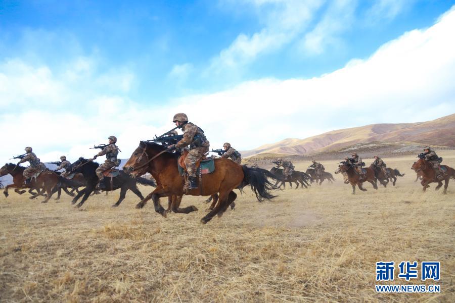 1月5日,陆军第76集团军某旅骑兵连在青藏高原腹地开展骑兵综合演练。新华社发(文明 摄)