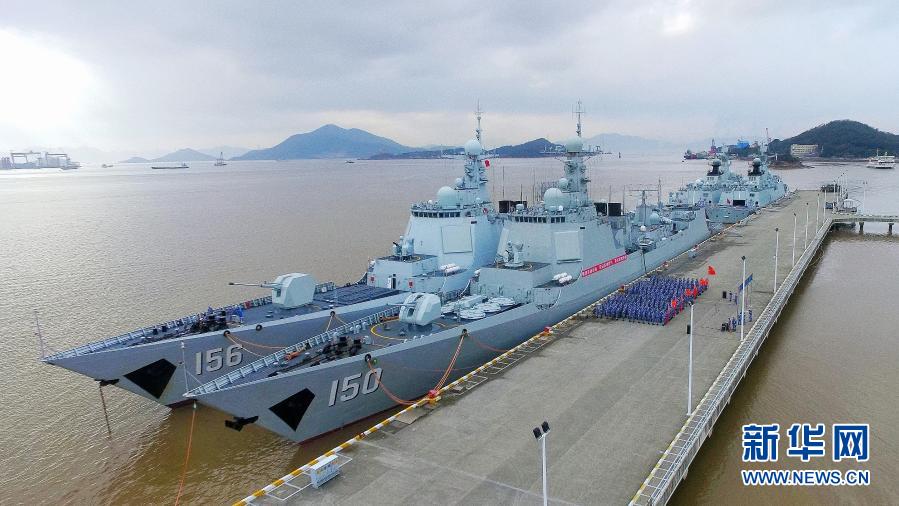 1月4日,东部战区海军某驱逐舰支队在舟山某军港码头举行开训动员(无人机照片)。新华社发(单新哲 摄)