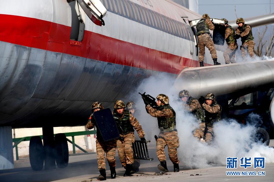 1月4日,武警山西总队机动支队特战队员开展反劫机演练。新华社发(孙玉山 摄)