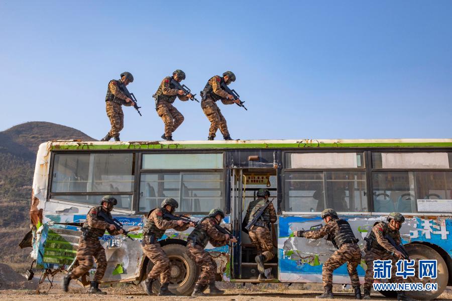 1月4日,武警广西总队贺州支队特战队员组织交通工具反劫持演练。新华社发(余海洋 摄)