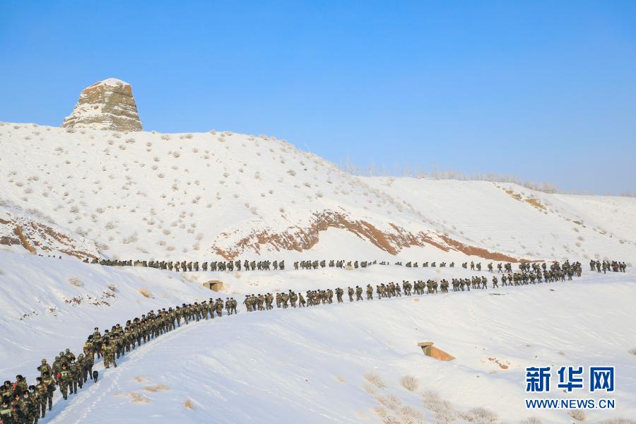 1月4日,武警新疆总队某机动支队拉练官兵穿越雪域进行长途行军。新华社发(张文 摄)