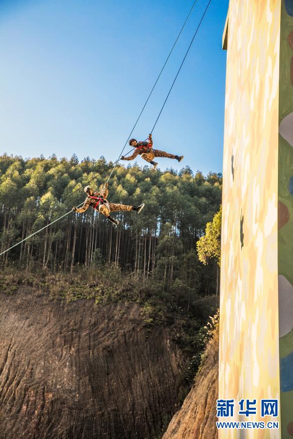 1月4日,武警广西总队来宾支队特战队员进行攀登侧身下滑训练。新华社发(果志远 摄)