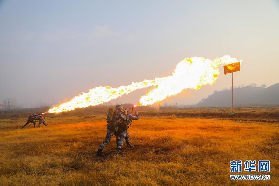 1月4日,驻鄂空降兵某旅组织防化兵开展喷火训练。新华社发(杨灏峰 摄)