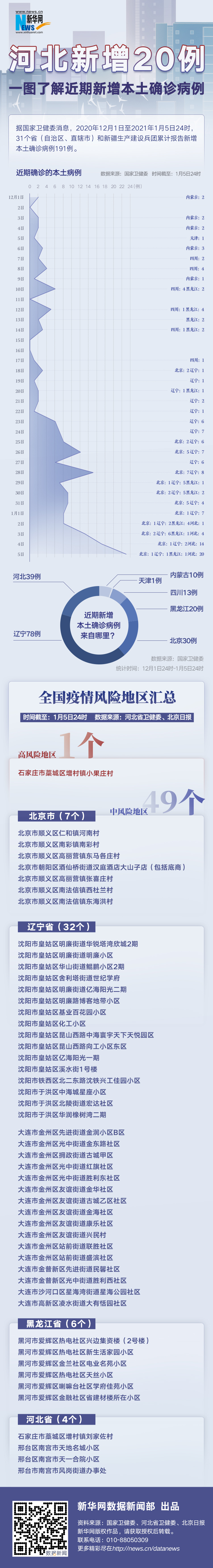 河北省卫健委6日发布,1月5日0—24时,河北省新增20例本地确诊病例,其中石家庄市报告19例,邢台市报告1例。同时,全省新增43例本地无症状感染者,其中石家庄市报告41例,邢台市报告2例。
