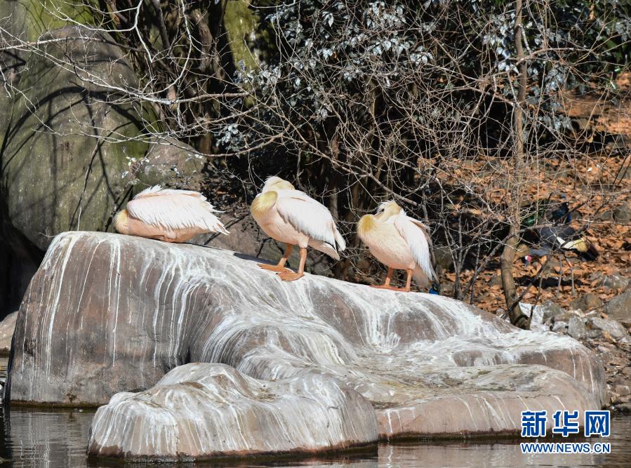 1月8日,合肥野生动物园的鹈鹕在水边休憩。