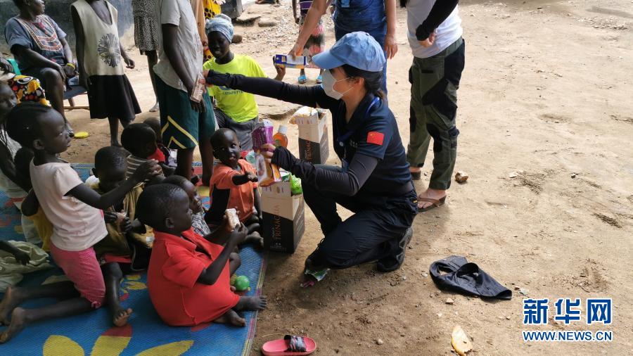 这是2020年10月,在南苏丹首都朱巴,廖洁慰问当地孤儿院的儿童。新华社发