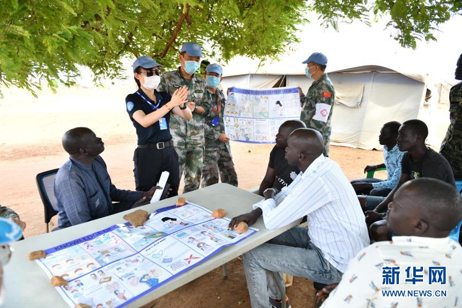 这是2020年3月,在南苏丹首都朱巴,廖洁给当地警察讲解防疫知识。新华社发