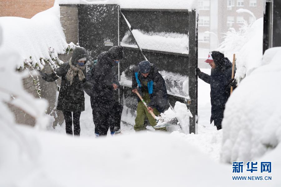 1月9日,在西班牙马德里,居民清理公寓楼地下停车场门口的积雪。