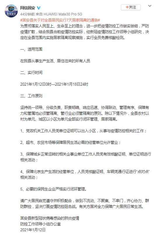 据河北固安县委网络安全和信息化委员会办公室官方微博消息,固安县新型冠状病毒感染的肺炎疫情防控工作领导小组办公室12日发布通告称,对全县居民实行7天居家隔离。