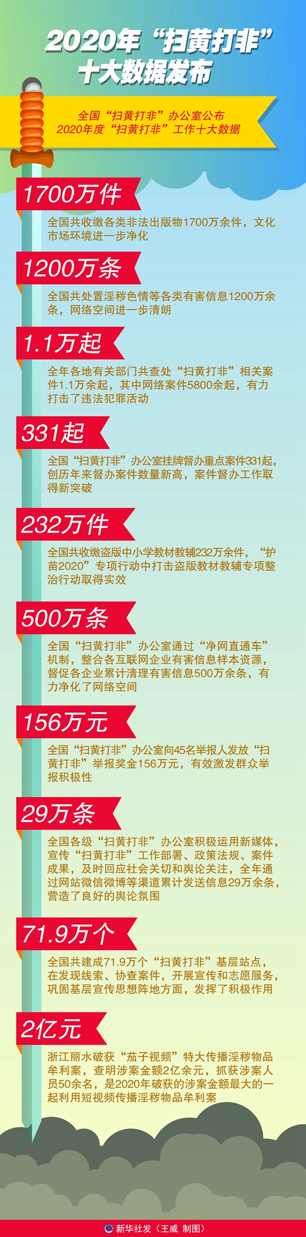 新华社北京1月13日电(记者白瀛、范思翔、史竞男)全国“扫黄打非”办公室公布2020年度“扫黄打非”工作十大数据。2020年,各地“扫黄打非”部门围绕中心、服务大局,统筹疫情防控和业务开展,加强网上有害信息清理,狠抓网下文化市场整治,严厉查处各类案件,大力营造全社会保护未成年人的良好氛围,工作成效显著。