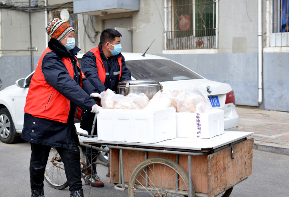 1月6日,“油条夫妻”李明、王丽梅夫妇将油条豆浆送至铁西区西站社区一处核酸检测点。新华社发