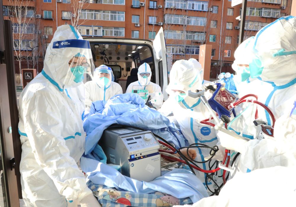 1月4日,中国医科大学附属第一医院重症科医生朱然(左一)在转运危重患者。 新华社发