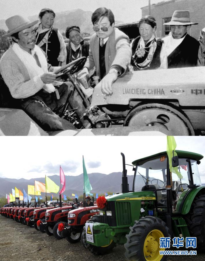 上图是1996年,山东省援助西藏的首批农机物资日前抵达日喀则。图为山东援藏干部在给当地藏族农民讲解农机具的使用方法(新华社记者 土登 摄);