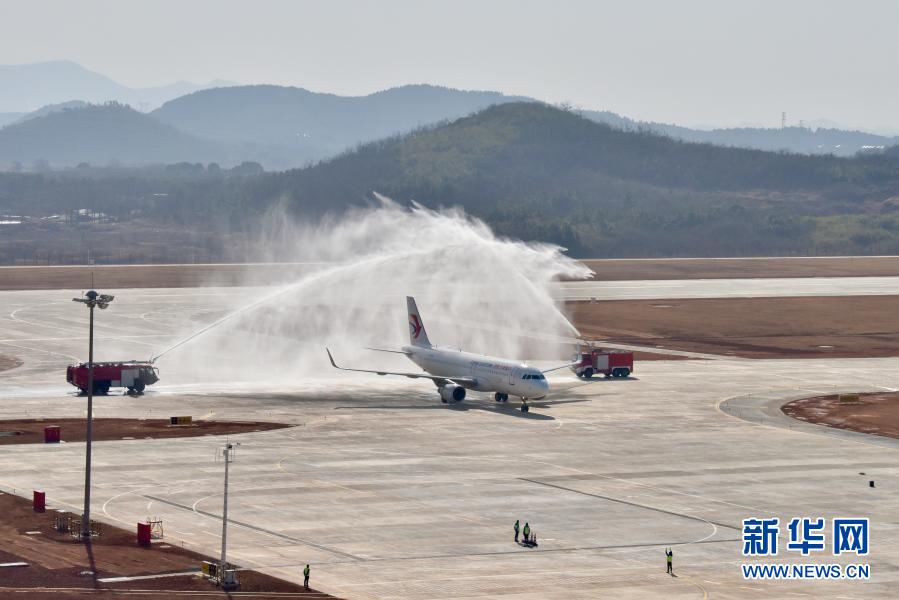 1月13日,执行验证试飞任务的中国东方航空客机在芜湖宣州机场穿过水门。新华社记者 汤阳 摄