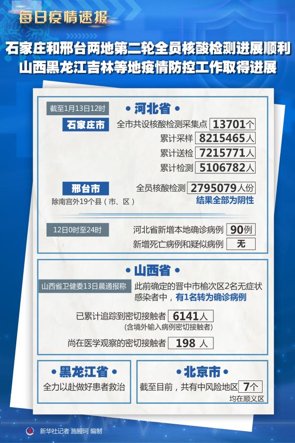 新华社石家庄1月13日电(记者刘桃熊、李继伟)记者13日从石家庄和邢台两市新冠肺炎疫情防控工作新闻发布会上了解到,两市第二轮全员核酸检测稳步推进,进展顺利。