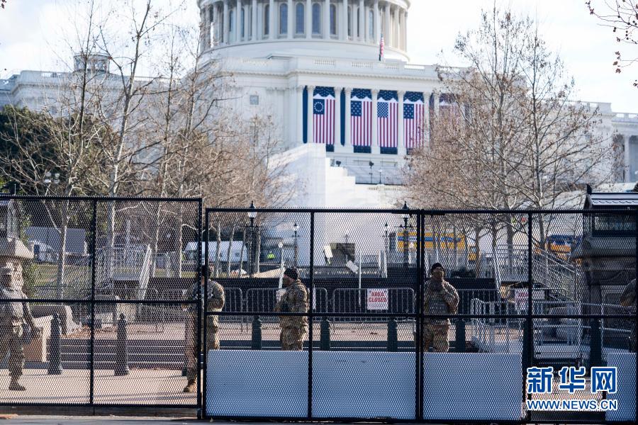1月13日,在美国首都华盛顿,国民警卫队士兵在国会大厦外警戒。新华社记者 刘杰 摄