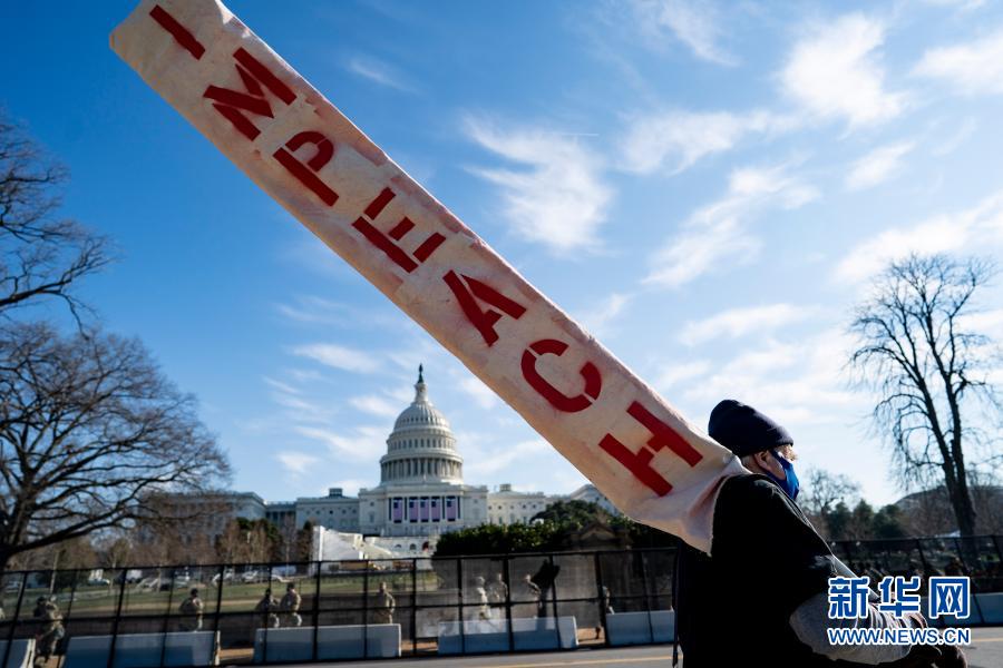 1月13日,在美国首都华盛顿,一名手持“弹劾”标语的男子从国会大厦前走过。新华社记者 刘杰 摄