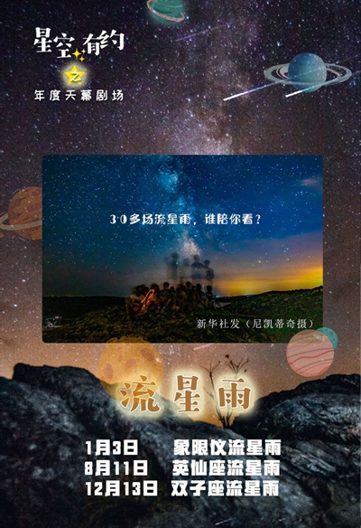 新华社南京1月14日电(记者王珏玢)2021年“天幕大戏”精彩纷呈,流星雨、行星合月、超级月亮、日月食等轮番上演。中科院紫金山天文台科普和历算专家筛选出一份“2021值得期待的天象日历”,并从中重点推荐8场最有“看点”的天象,感兴趣的你不容错过。