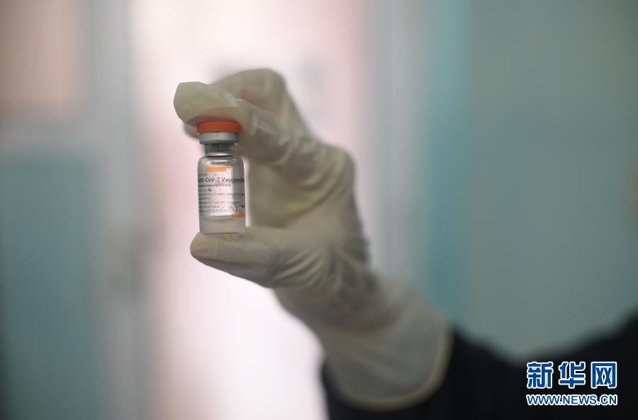 1月15日,在印度尼西亚万丹省南唐格朗,医务人员展示中国科兴公司的克尔来福新冠疫苗。