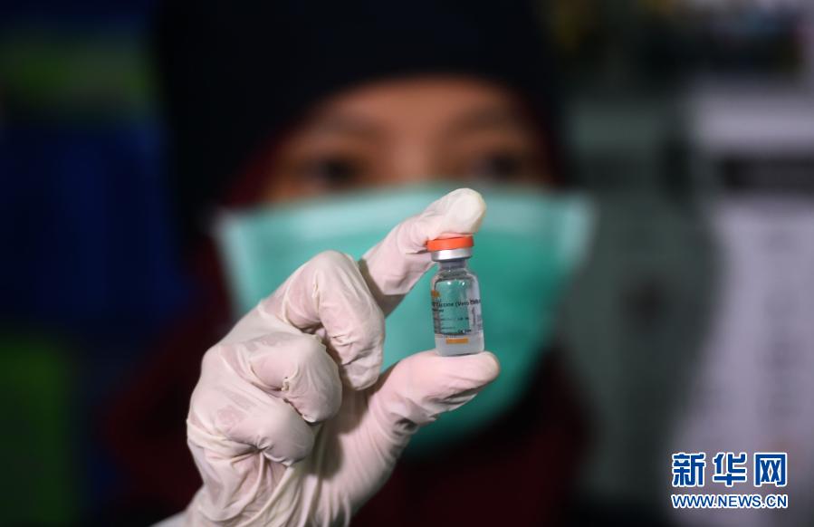 1月15日,在印度尼西亚万丹省南唐格朗,医务人员展示中国科兴公司的克尔来福新冠疫苗。新华社发(祖卡南摄)