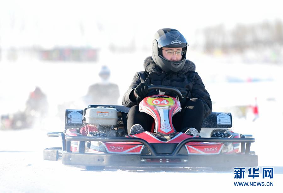 1月15日,在陈巴尔虎旗巴彦库仁镇,游客在体验雪地卡丁车。