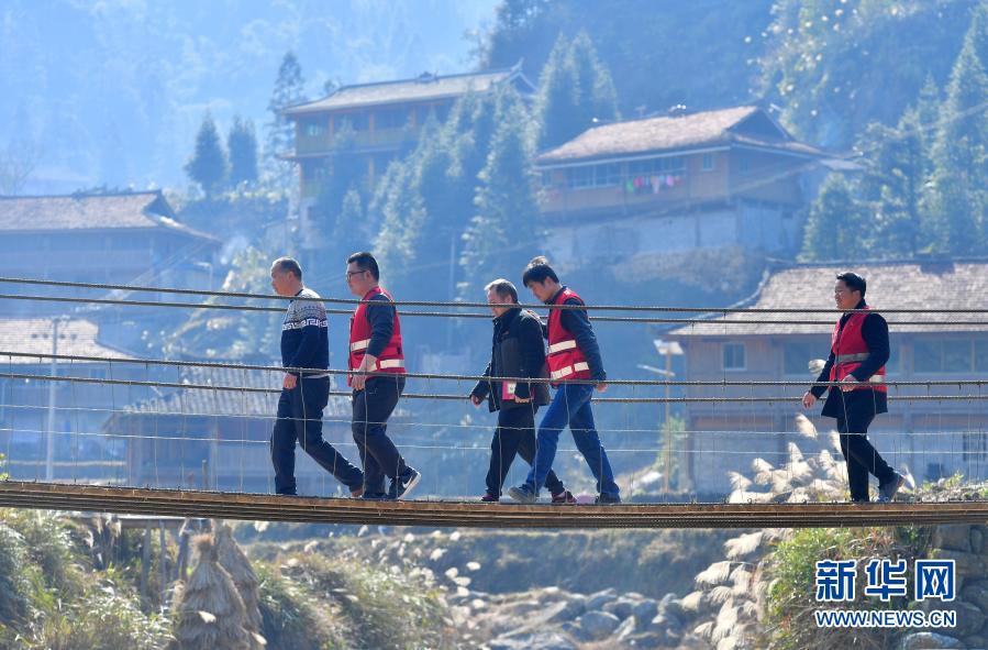 1月15日,在广西融水苗族自治县杆洞乡党鸠村,驻村工作队新老队员在新建的悬索桥上查看苗寨新貌。