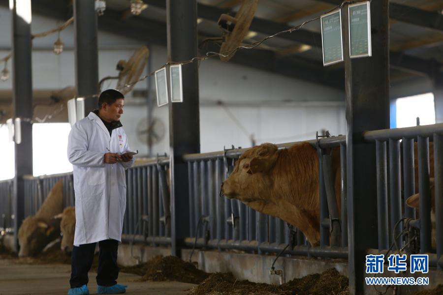 在泌阳县夏南牛原种场,祁兴磊科研团队的研究员林凤鹏巡场记录种牛情况(1月14日摄)。30多年来,林凤鹏一直跟牛打交道,管理牛群、培育种牛、记录体测数据,在肉牛遗传育种领域深耕细作,致力于研发更优质的夏南牛,新品系“无角夏南牛”也在培育当中。
