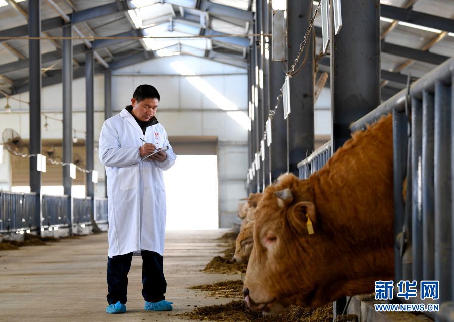 在泌阳县夏南牛原种场,祁兴磊科研团队的研究员林凤鹏在巡场记录夏南牛种牛情况(1月14日摄)。