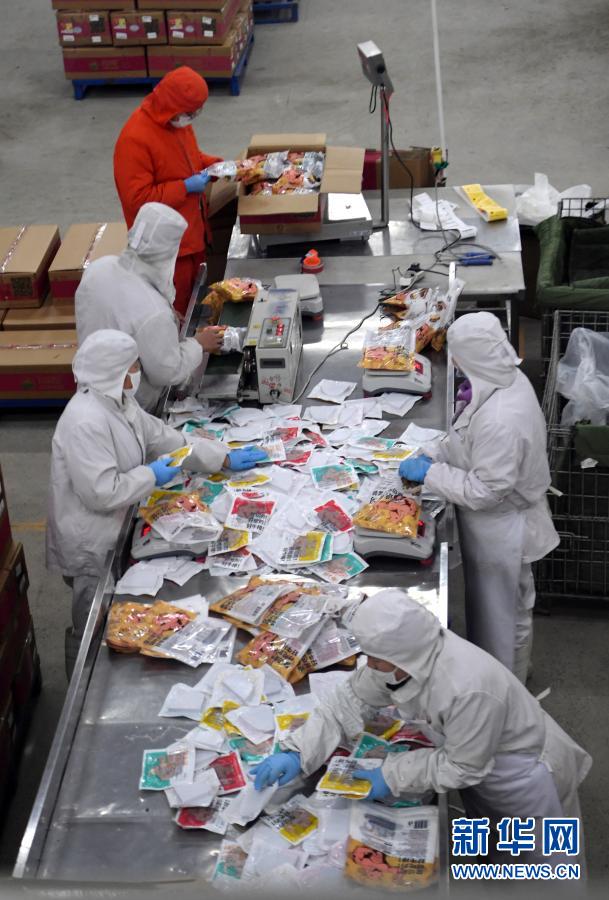 在河南恒都食品有限公司牛肉初加工外包车间,质检员宋仁旗(左上)在抽检产品(1月14日摄)。